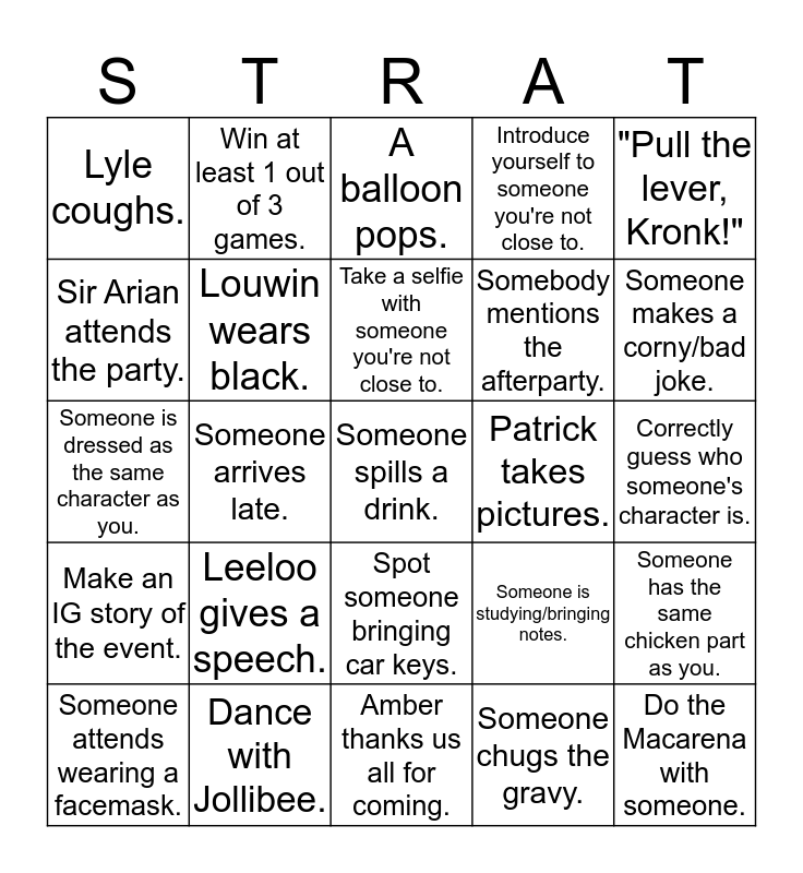 This bingo card has 25 words: Leeloo gives a speech., Amber thanks us all for coming., Take a selfie with someone you're not close to., Someone attends wearing a facemask., "Pull the lever, Kronk!", Lyle coughs., Sir Arian attends the party., Win at least 1 out of 3 games., Patrick takes pictures., Spot someone bringing car keys., Somebody mentions the afterparty., Someone is dressed as the same character as you., Someone is studying/bringing notes., Someone has the same chicken part as you., Louwin wears black., Do the Macarena with someone., Correctly guess who someone's character is., A balloon pops., Someone makes a corny/bad joke., Someone arrives late., Someone spills a drink., Dance with Jollibee., Make an IG story of the event., Introduce yourself to someone you're not close to. and Someone chugs the gravy..