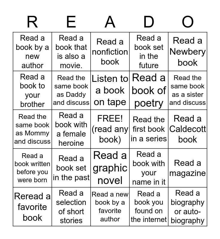This bingo card has a free space and 24 words: Read a book set in the past, Read a selection of short stories, Listen to a book on tape, Reread a favorite book, Read a Newbery book, Read a book by a new author, Read a book to your brother, Read a book that is also a movie., Read the first book in a series, Read a graphic novel, Read a book of poetry, Read the same book as Mommy and discuss, Read a book with your name in it, Read a magazine, Read the same book as Daddy and discuss, Read a book you found on the internet, Read a Caldecott book, Read a nonfiction book, Read the same book as a sister and discuss, Read a book with a female heroine, Read a biography or auto-biography, Read a book written before you were born, Read a book set in the future and Read a new book by a favorite author.