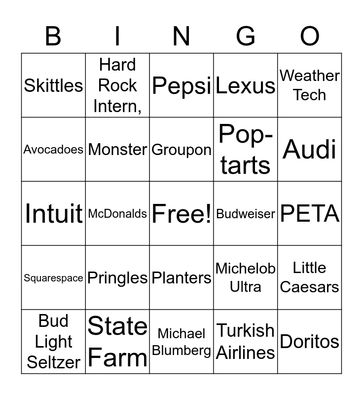 This bingo card has a free space and 80 words: Death Wish Coffee, Sprite, Pepsi, Coke, Bud Light, Budweiser, Michelob Ultra, Mountain Dew, Stella Artois, Kia, Hyundai, Toyota, Lexus, Skittles, Doritos, Avocadoes, M & M, Pringles, Kraft, PETA, Taco Bell, Weather Tech, Intuit, Groupon, Monster, Verizon, Squarespace, Amazon, Febreze, Amazon, Audi, Avocados Mex, Michael Blumberg, Bud Light, Bud Light Seltzer, Budweiser, Cheetos, Coca-Cola, Dashlane, Doritos, Facebook, Fiat, GM Hummer, Genesis, Google, Hard Rock Intern,, Heinz, Hershey, Sonata, Kia, Little Caesars, McDonalds, Michelob Ultra, Microsoft, Mtn Dew, New York Life, Olay, Paramount pics, Pepsi, Planters, Pop-tarts, Porsche, Pringles, Pure Gold, Quibi, Quicken Loans, Reeses Take5, Sabra, Snickers, Soda Stream, Squarespace, State Farm, Tide, Toyota, Donald Trump, Turbo Tax, Turkish Airlines, Verizon, Walmart and Weather Tech.