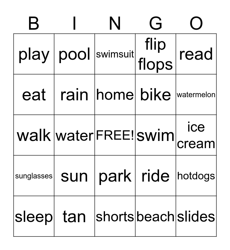 This bingo card has a free space and 24 words: sun, tan, home, sleep, read, play, eat, pool, swim, park, bike, walk, ride, hotdogs, rain, beach, ice cream, swimsuit, watermelon, water, slides, sunglasses, flip flops and shorts.