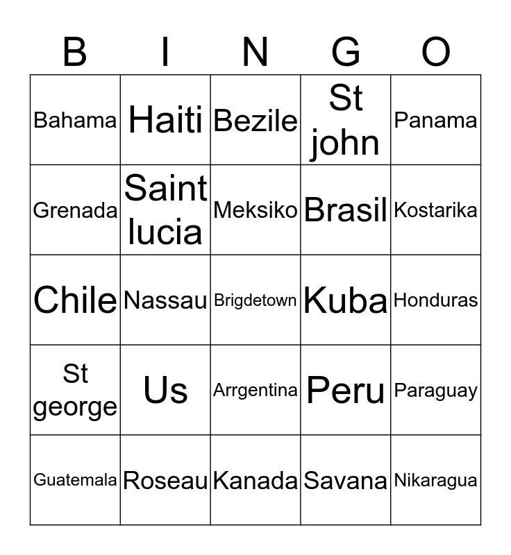 This bingo card has 25 words: Us, Kanada, Meksiko, Guatemala, Panama, Bahama, Grenada, Haiti, Kuba, Arrgentina, Brasil, Chile, Peru, Paraguay, Saint lucia, Nikaragua, Honduras, Bezile, Kostarika, Nassau, Brigdetown, Roseau, St george, St john and Savana.