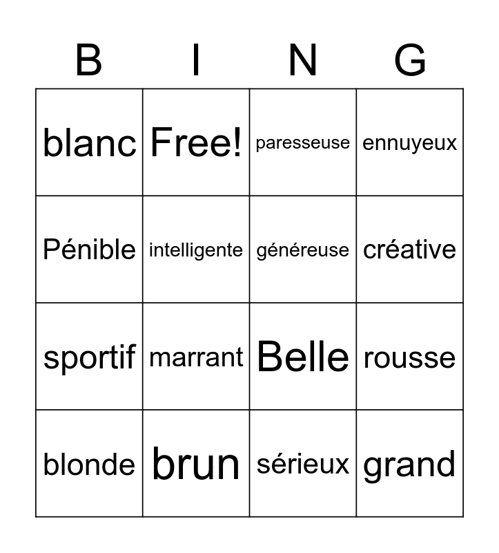 This bingo card has 19 words: Belle, nouveau, paresseuse, grand, rousse, Pénible, sérieux, blanc, Free!, sportif, marrant, intelligente, généreuse, brun, blonde, Vieux, ennuyeux, créative and timide.