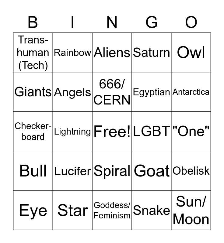 This bingo card has a free space and 29 words: Eye, Triangle/ Pyramid, Lightning, Trans-human (Animal), Trans-human (Tech), Aliens, Angels, Lucifer, LGBT, Star, "One", Sun/ Moon, Goddess/ Feminism, Snake, Antarctica, DNA, Spiral, Bull, Owl, Checker-board, Goat, Magic/ Witchcraft, Egyptian, Giants, Saturn, Rainbow, Obelisk, 666/ CERN and Portal.