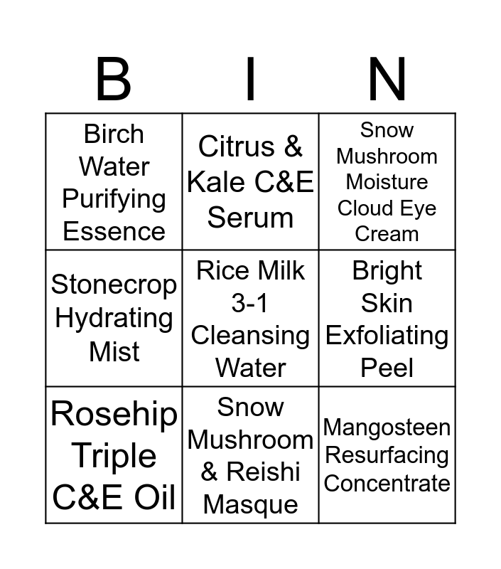 This bingo card has a free space and 8 words: Bright Skin Exfoliating Peel, Snow Mushroom Moisture Cloud Eye Cream, Citrus & Kale C&E Serum, Rosehip Triple C&E Oil, Birch Water Purifying Essence, Mangosteen Resurfacing Concentrate, Stonecrop Hydrating Mist and Snow Mushroom & Reishi Masque.