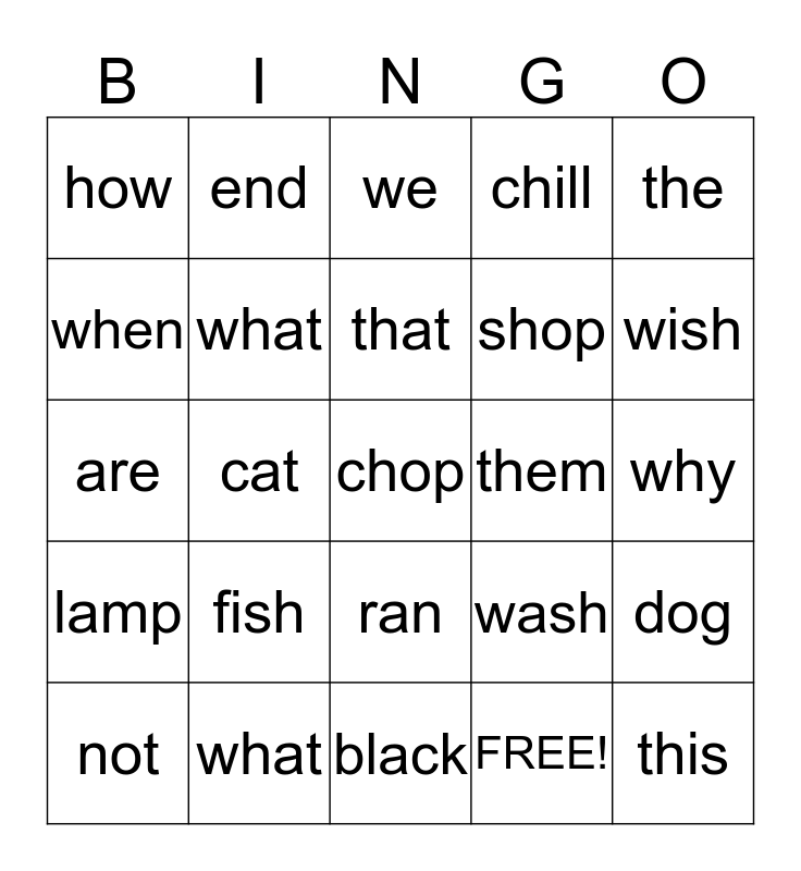 This bingo card has 32 words: FREE!, box, cat, jump, lamp, what, the, dog, end, this, that, we, me, she, them, said, not, are, ran, fish, wash, are, why, what, chop, chill, shop, when, how, black, red and wish.
