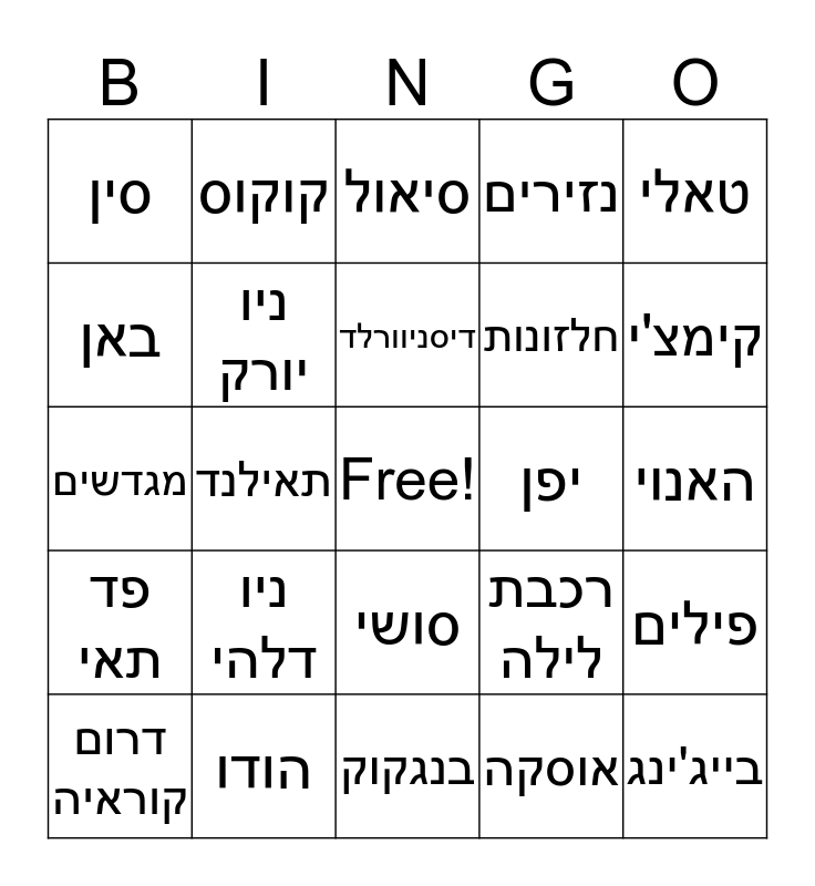 This bingo card has a free space and 29 words: דרום קוראיה, ארצות הברית, תאילנד, ויאטנם, סין, סיאול, ניו יורק, ניו דלהי, יפן, הודו, האנוי, בייג'ינג, בנגקוק, אוסקה, קימצ'י, המבורגר, סושי, פד תאי, טאלי, מגדשים, רכבת לילה, פנדות, חלזונות, באן, נזירים, קוקוס, פילים, דיסניוורלד and סופת שלגים.