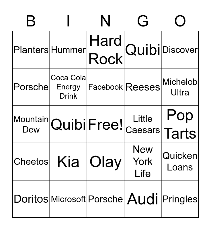 This bingo card has a free space and 34 words: Amazon Prime "Hunters", Audi, Avocados from Mexico, Bud Light Seltzer, Cheetos, Coca Cola Energy Drink, Discover, Doritos, Hummer, Google Virtual Assistant, Facebook, Hard Rock, Heinz, Hyundai, Little Caesars, Michelob Ultra, Microsoft, Mountain Dew, Kia, New York Life, Olay, Pepsi, Planters, Pop Tarts, Porsche, Pringles, Quibi, Quicken Loans, Reeses, Porsche, Pringles, Quibi, Quicken Loans and Reeses.