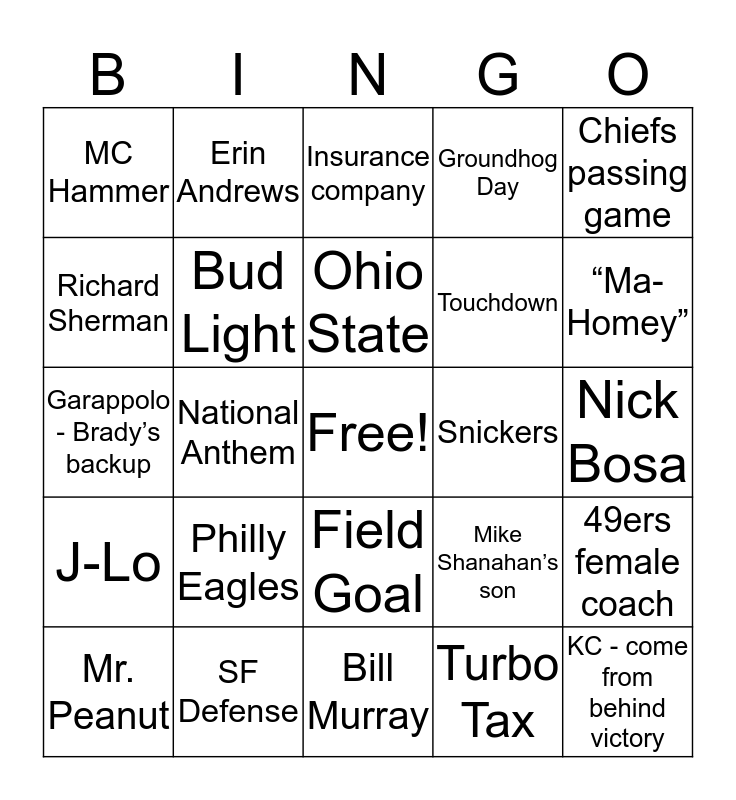 This bingo card has a free space and 29 words: Mr. Peanut, Miami FL, National Anthem, Avocados from Mexico, MC Hammer, Insurance company, Bud Light, Philly Eagles, Snickers, SF Defense, Nick Bosa, KC - come from behind victory, Bill Murray, Turbo Tax, “Ma-Homey”, 50 yrs since KC was in SB, Field Goal, J-Lo, Chiefs passing game, Garappolo - Brady’s backup, Mike Shanahan’s son, Miami hosted most SBs, Touchdown, Richard Sherman, Groundhog Day, Erin Andrews, 49ers female coach, Ohio State and Interception.