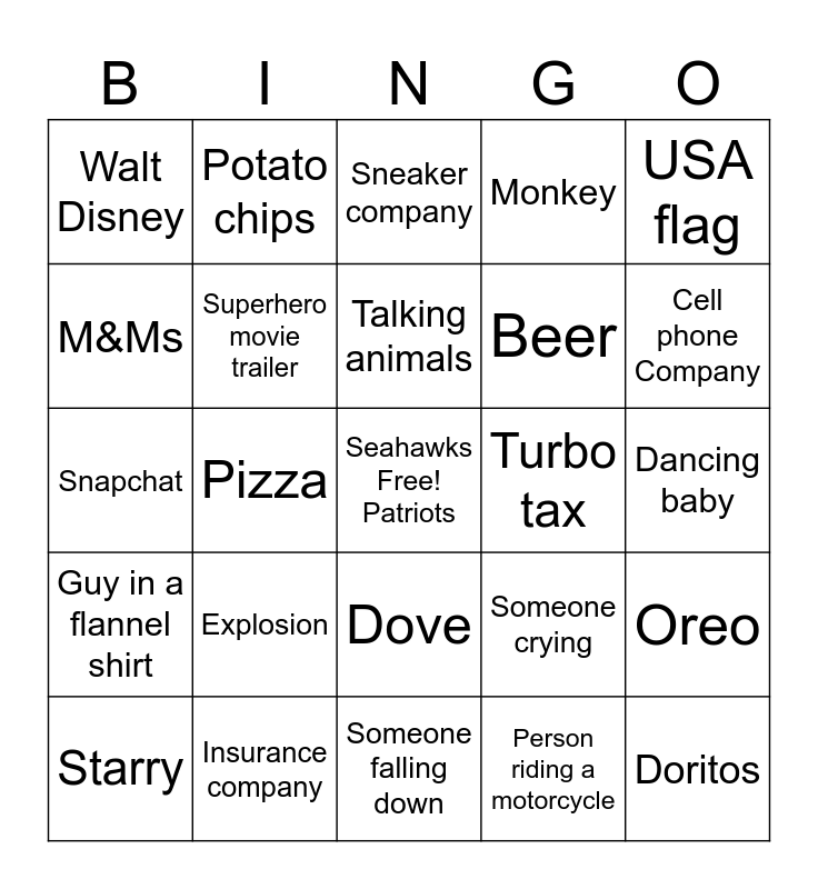 This bingo card has a free space and 39 words: Talking Baby, Coke, State Farm, Superhero movie trailer, Starry, Dove, Talking animals, Horses, USA flag, Guy in a flannel shirt, Pizza, Monkey, Doritos, Dancing baby, Turbo tax, Explosion, TD bank, Walt Disney, Google, Someone crying, M&Ms, Someone falling down, Beer, Cell phone Company, E Trade, Sports drink, Upcoming TV show, Bet MGM, Jesus, Potato chips, Dog, McDonalds, Sneaker company, Insurance company, Person riding a motorcycle, Trump, Oreo, Snapchat and The beach.