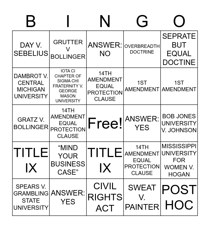 This bingo card has a free space and 24 words: “MIND YOUR BUSINESS CASE”, ANSWER: YES, 14TH AMENDMENT EQUAL PROTECTION CLAUSE, SPEARS V. GRAMBLING STATE UNIVERSITY, SEPRATE BUT EQUAL DOCTINE, DAY V. SEBELIUS, DAMBROT V. CENTRAL MICHIGAN UNIVERSITY, GRUTTER V BOLLINGER, ANSWER: YES, TITLE IX, 1ST AMENDMENT, GRATZ V. BOLLINGER, 14TH AMENDMENT EQUAL PROTECTION CLAUSE, MISSISSIPPI UNIVERSITY FOR WOMEN V. HOGAN, IOTA CI CHAPTER OF SIGMA CHI FRATERNITY V. GEORGE MASON UNIVERSITY, SWEAT V. PAINTER, BOB JONES UNIVERSITY V. JOHNSON, ANSWER: NO, 1ST AMENDMENT, 14TH AMENDMENT EQUAL PROTECTION CLAUSE, POST HOC, TITLE IX, OVERBREADTH DOCTRINE and CIVIL RIGHTS ACT.