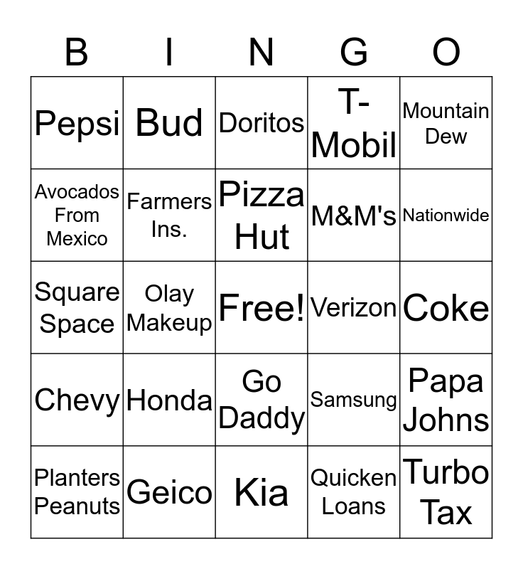 This bingo card has a free space and 24 words: Honda, Geico, Pizza Hut, Planters Peanuts, Mountain Dew, Pepsi, Avocados From Mexico, Bud, Verizon, Go Daddy, M&M's, Square Space, Samsung, Papa Johns, Farmers Ins., Quicken Loans, Coke, Doritos, Nationwide, Olay Makeup, Turbo Tax, Chevy, T-Mobil and Kia.