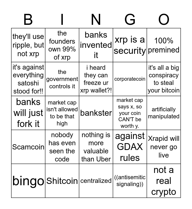 This bingo card has 26 words: Scamcoin, Shitcoin, i heard they can freeze ur xrp wallet?!, ((antisemitic signaling)), 100% premined, they'll use ripple, but not xrp, the government controls it, banks invented it, corporatecoin, not a real crypto, it's against everything satoshi stood for!!, market cap isn't allowed to be that high, centralized, against GDAX rules, artificially manipulated, ripple will print more xrp, the founders own 99% of xrp, nothing is more valuable than Uber, xrp is a security, Xrapid will never go live, banks will just fork it, nobody has even seen the code, bankster, market cap says x, so your coin CAN'T be worth y., it's all a big conspiracy to steal your bitcoin and bingo.