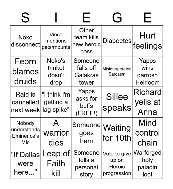 This bingo card has a free space and 24 words: A warrior dies, Leap of Faith kill, Someone falls off Galakras tower, "If Dallas were here...", Hurt feelings, Noko disconnect, Feorn blames druids, Vince mentions pets/mounts, Sillee speaks, Someone goes ham, Misinterpereted Sarcasm, Raid is cancelled next week, Waiting for 10th, Mind control chain, Noko's trinket dosn't drop, Vote to give up on Heroic progression, Richard yells at Anna, Other team kills new heroic boss, Yapps wins garrosh Heirloom, "I think i'm getting a lag spike", Warforged holy paladin loot, Nobody understands Eminence's Mic, Diabeetes and Someone tells a personal story.