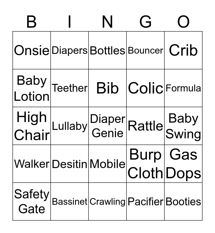 This bingo card has 25 words: Desitin, Crawling, Bib, Safety Gate, Crib, Onsie, Baby Lotion, Diapers, Rattle, Mobile, Colic, High Chair, Burp Cloth, Gas Dops, Teether, Booties, Baby Swing, Bottles, Formula, Lullaby, Diaper Genie, Bassinet, Walker, Bouncer and Pacifier.