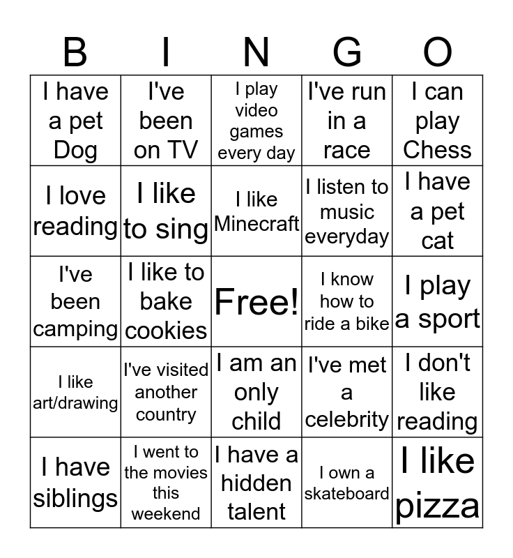 This bingo card has a free space and 29 words: I have siblings, I know how to play an instrument, I like to bake cookies, I want to go skydiving, I have a pet Dog, I play video games every day, I like to sing, I've visited another country, I know how to ride a bike, I went to the movies this weekend, I play a sport, I like pizza, I have a hidden talent, I own a skateboard, I have a pet cat, I like swimming, I am an only child, I like art/drawing, I can play Chess, I've been camping, I've met a celebrity, I like board games, I listen to music everyday, I love reading, I've run in a race, I've been on TV, I don't like reading, I like Minecraft and I like Fortnite.