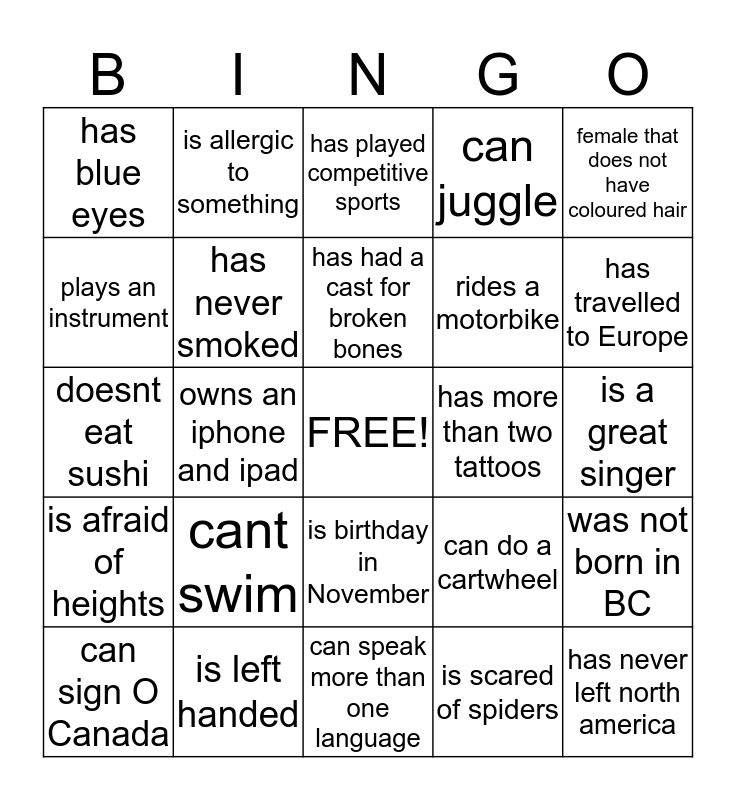 This bingo card has a free space and 24 words: cant swim, is left handed, has had a cast for broken bones, can sign O Canada, female that does not have coloured hair, has blue eyes, plays an instrument, is allergic to something, has more than two tattoos, is birthday in November, rides a motorbike, doesnt eat sushi, can do a cartwheel, was not born in BC, has never smoked, is scared of spiders, is a great singer, has played competitive sports, has travelled to Europe, owns an iphone and ipad, has never left north america, is afraid of heights, can juggle and can speak more than one language.