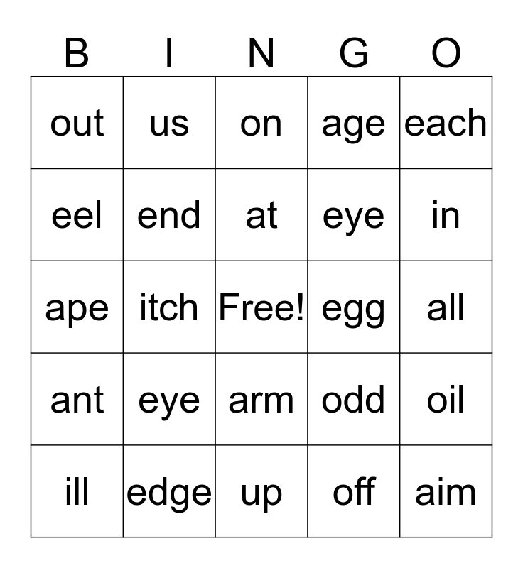 This bingo card has a free space and 27 words: axe, edge, at, off, each, eel, us, up, egg, oil, ant, end, odd, aim, ape, owl, on, age, all, out, eye, arm, eye, in, ill, itch and ice.