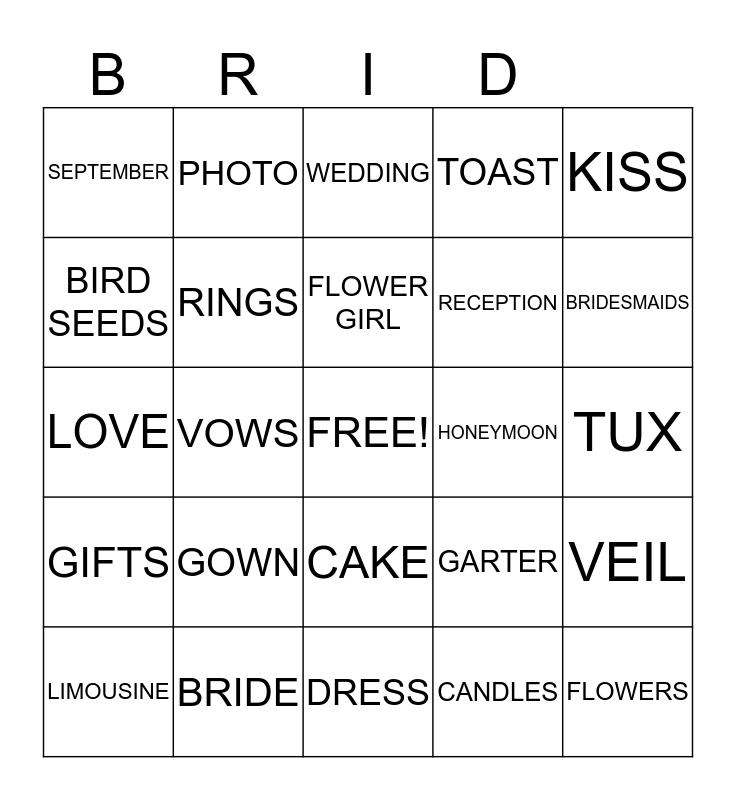 This bingo card has a free space and 30 words: BRIDE, GROOM, VOWS, PARTY, SEPTEMBER, WEDDING, RINGS, CAKE, HONEYMOON, DRESS, TUX, FLOWERS, CANDLES, BEST MAN, BRIDESMAIDS, CHAPEL, GARTER, GIFTS, GOWN, KISS, LOVE, MARRIAGE, PHOTO, RECEPTION, BIRD SEEDS, TOAST, VEIL, LIMOUSINE, FLOWER GIRL and GROOMSMEN.