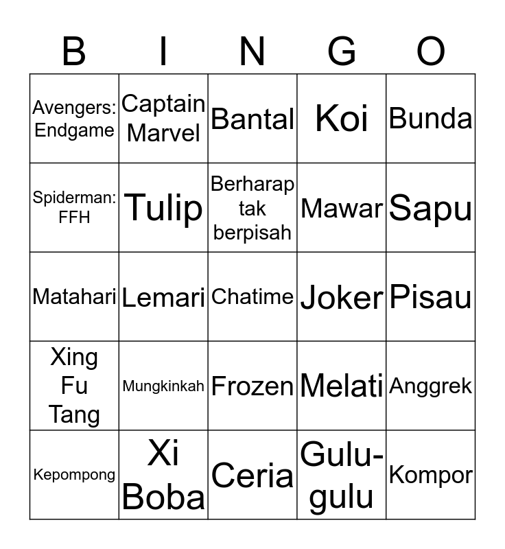 This bingo card has 25 words: Mungkinkah, Ceria, Berharap tak berpisah, Kepompong, Bunda, Avengers: Endgame, Spiderman: FFH, Captain Marvel, Joker, Frozen, Mawar, Matahari, Melati, Anggrek, Tulip, Kompor, Pisau, Bantal, Sapu, Lemari, Chatime, Xi Boba, Xing Fu Tang, Koi and Gulu-gulu.
