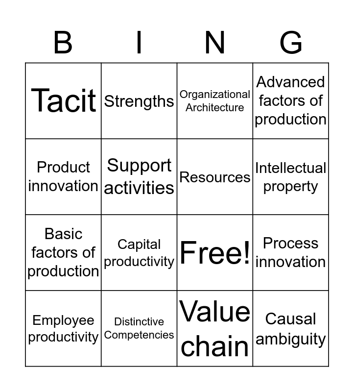 This bingo card has 21 words: Distinctive Competencies, Barriers to imitation, Strengths, Weaknesses, Value chain, Resources, Tacit, Organizational Architecture, Free!, Intellectual property, Basic factors of production, Advanced factors of production, Causal ambiguity, Primary activities, Support activities, Benchmarking, Employee productivity, Capital productivity, Product innovation, Process innovation and Customer response time.