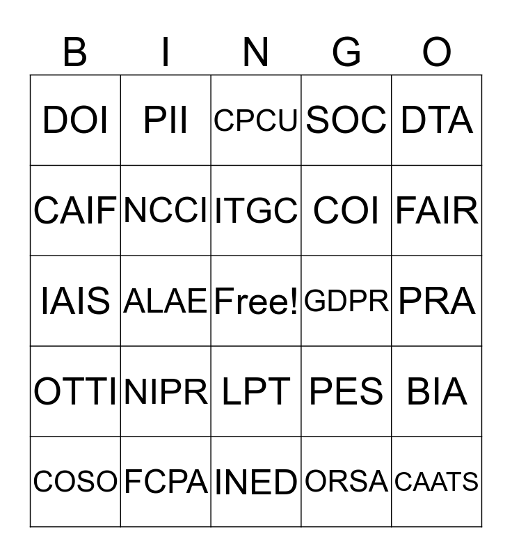 This bingo card has a free space and 29 words: COSO, IIA, ALAE, DUA, DOI, CPCU, NCCI, NIPR, GDPR, FCPA, PRA, CAATS, INED, ORSA, FAIR, NAIR, LPT, OTTI, DTA, IAIS, PES, CFE, COI, CAIF, SOC, PII, BIA, ITGC and CISA.