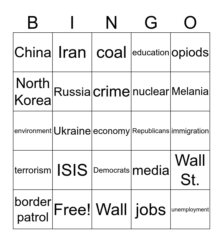 This bingo card has 30 words: Free!, impeachment, Ukraine, tariffs, China, coal, Russia, Democrats, Republicans, Wall, immigration, economy, jobs, unemployment, Melania, Israel, media, terrorism, ISIS, opiods, environment, first responders, Iran, nuclear, North Korea, education, Wall St., border patrol, crime and climate.