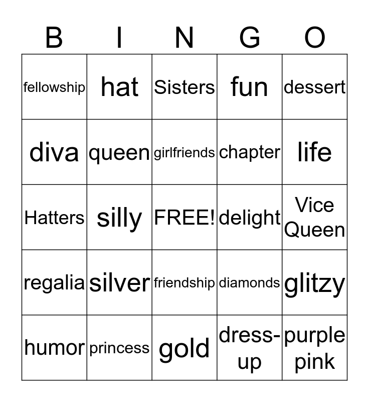 This bingo card has a free space and 47 words: red, purple pink, lavender, gold, silver, bling, hat, feather, diva, crown, queen, fun, glitzy, diamonds, play, tea, girlfriends, delight, shopping, dessert, silly, dress-up, fellowship, chapter, kazoo, life, humor, energy, friendship, regalia, pride, games, rhinestones, sock monkey, private Queen Mother, princess, Vice Queen, reduation, boa, convention, Hatquarters, Sisters, Hatters, Chatter, QMB, Secret Sisters Exchange and Mascots.