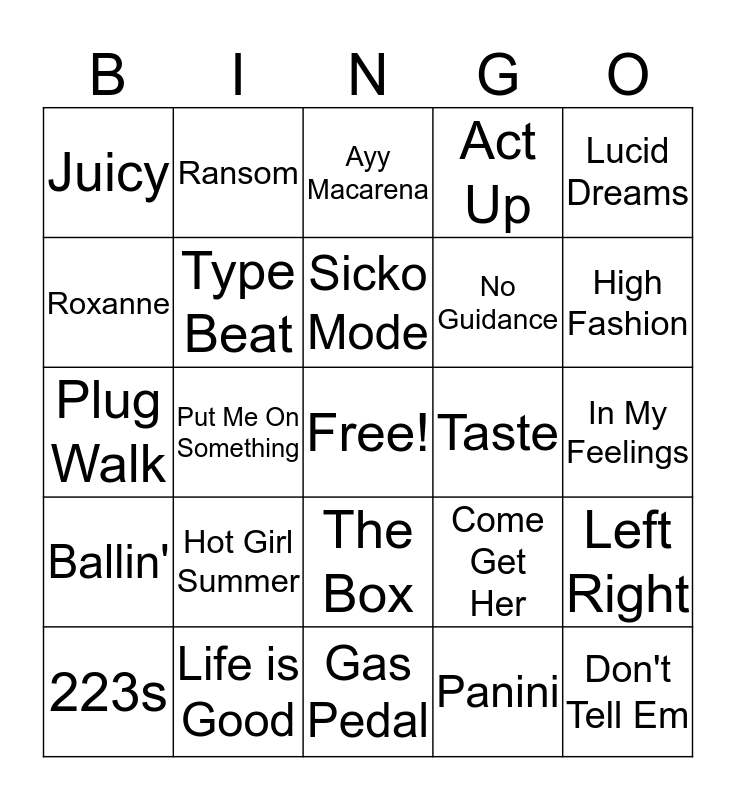 This bingo card has a free space and 26 words: The Box, Panini, Sicko Mode, Life is Good, Lucid Dreams, Juicy, Roxanne, Ransom, In My Feelings, Come Get Her, No Guidance, Plug Walk, Left Right, 223s, Put Me On Something, Ayy Ladies, Act Up, Ballin', Ayy Macarena, Don't Tell Em, High Fashion, Gas Pedal, Taste, Hot Girl Summer, Type Beat and Jerry Sprunger.