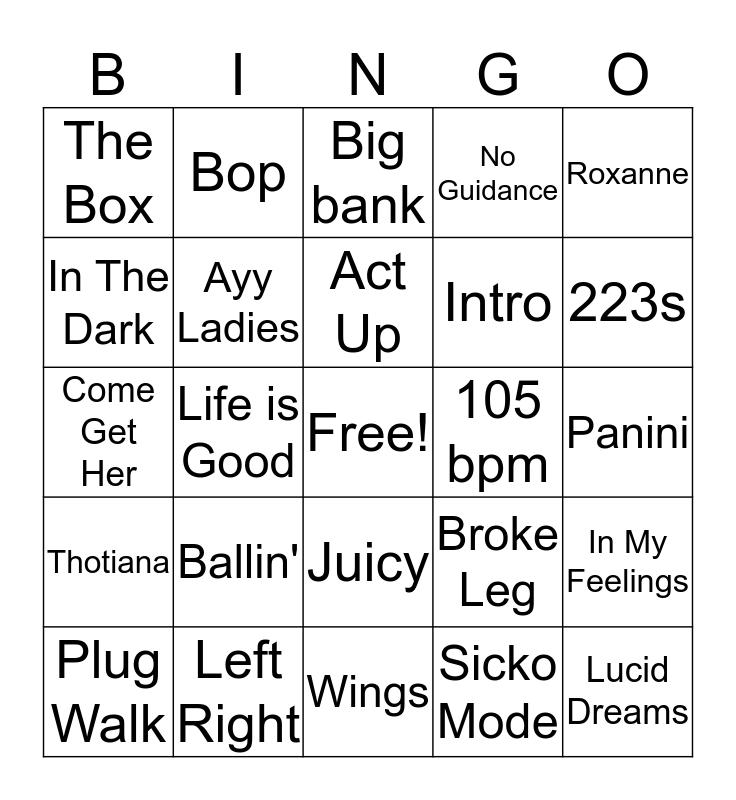 This bingo card has a free space and 27 words: Broke Leg, Bae, Intro, Wings, In The Dark, Big bank, Bop, Thotiana, 105 bpm, In My Feelings, Come Get Her, No Guidance, Plug Walk, Left Right, 223s, Put Me On Something, Ayy Ladies, Act Up, Ballin', The Box, Panini, Sicko Mode, Life is Good, Lucid Dreams, Juicy, Roxanne and Ransom.