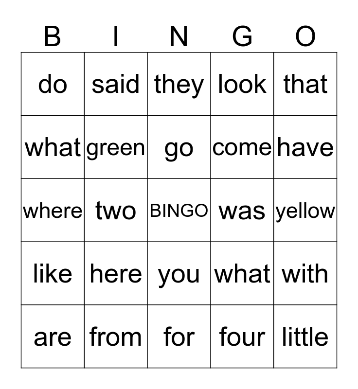 This bingo card has a free space and 24 words: here, from, go, are, that, do, what, said, was, you, come, where, what, with, green, four, yellow, they, have, two, little, like, look and for.