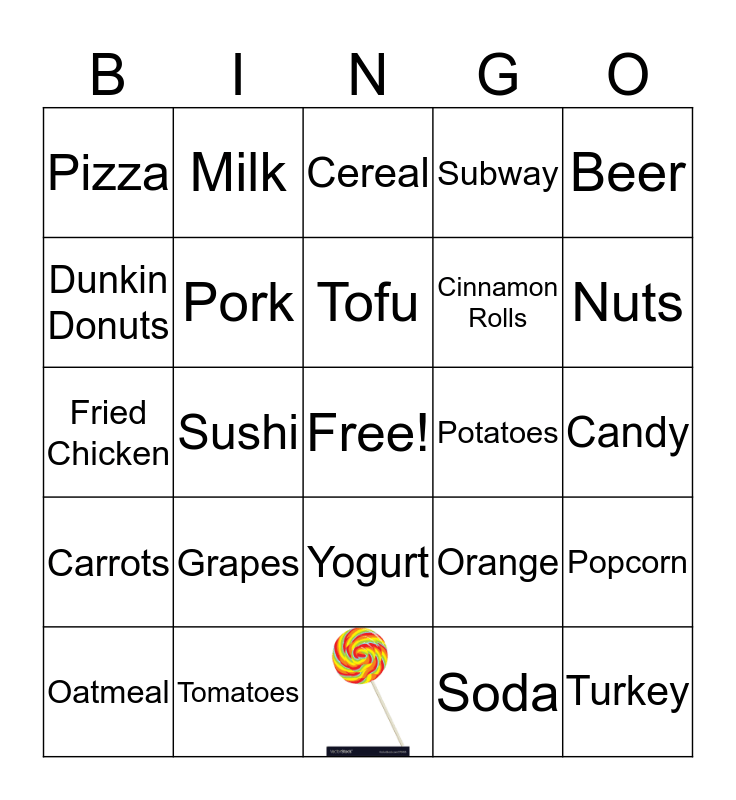 This bingo card has 1 images, a free space and 33 words: Rice, Soda, Pork, Beans, Carrots, Pork, Beer, Oatmeal, Milk, Green Beans, Tofu, Cereal, Steak, Apple, Potatoes, Nuts, Tomatoes, Fried Chicken, Grapes, Orange, Yogurt, Chicken, Pizza, Candy, Turkey, Subway, Eggs and Bacon, Cinnamon Rolls, Dunkin Donuts, Kale, Sushi, Popcorn and Smoothie.