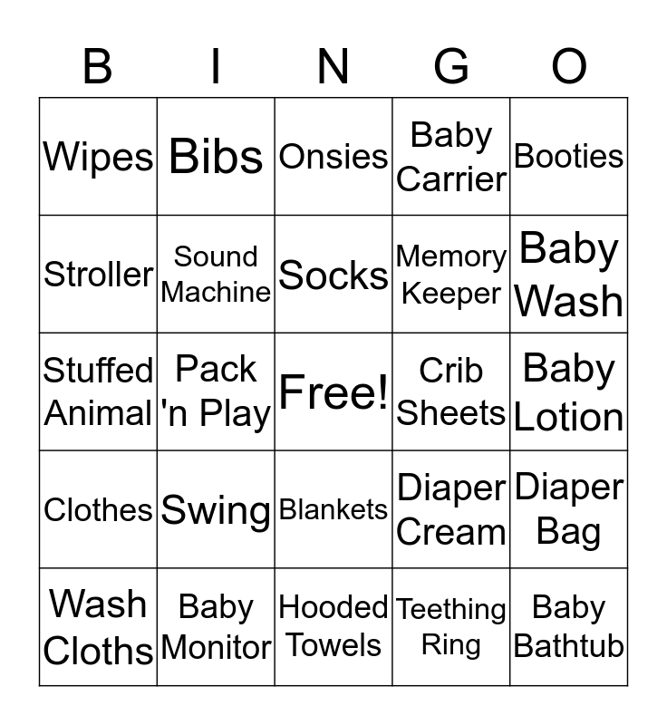This bingo card has a free space and 34 words: Pacifier, Teething Ring, Bottles, Baby Powder, Clothes, Sound Machine, Booties, Wash Cloths, Bibs, High Chair, Socks, Onsies, Burp Cloths, Diapers, Crib Sheets, Baby Wash, Baby Monitor, Stuffed Animal, Swing, Diaper Cream, Blankets, Sippy Cup, Wipes, Baby Lotion, Hooded Towels, Baby Bathtub, Baby Carrier, Hats, Memory Keeper, Stroller, Car Seat, Pack 'n Play, Diaper Bag and First-Aid.