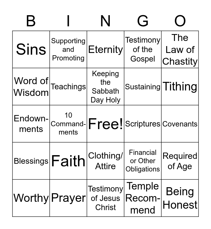 This bingo card has a free space and 24 words: Faith, Prayer, Keeping the Sabbath Day Holy, Worthy, The Law of Chastity, Sins, Word of Wisdom, Supporting and Promoting, Scriptures, Clothing/ Attire, Sustaining, Endown-ments, Financial or Other Obligations, Required of Age, Teachings, Temple Recom-mend, Covenants, Eternity, Tithing, 10 Command- ments, Being Honest, Blessings, Testimony of the Gospel and Testimony of Jesus Christ.