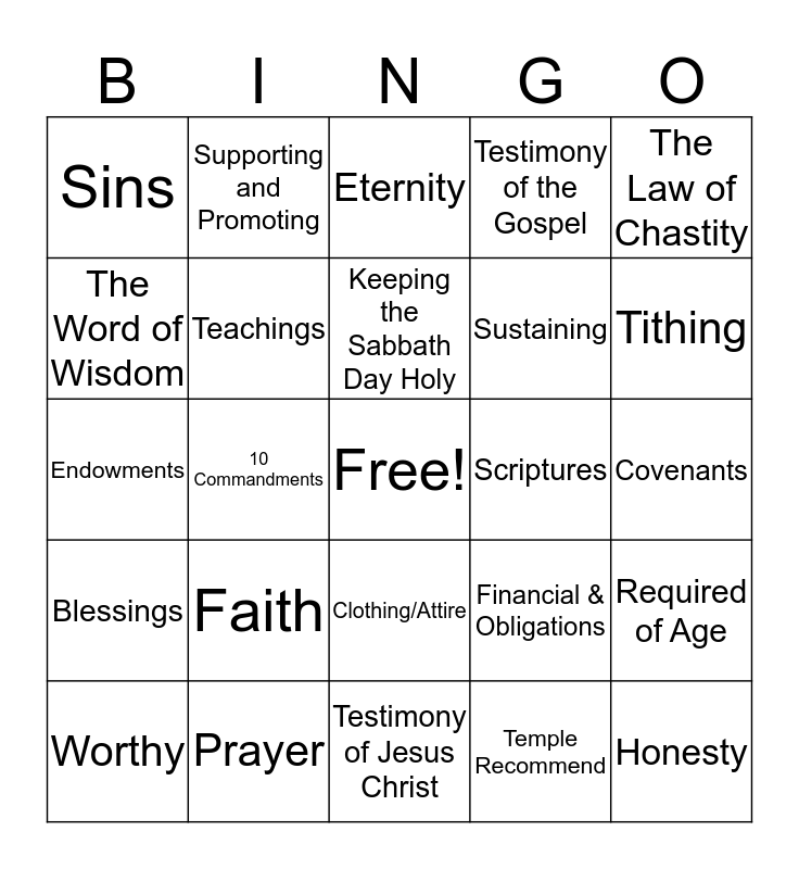 This bingo card has a free space and 24 words: Faith, Prayer, Keeping the Sabbath Day Holy, Worthy, The Law of Chastity, Sins, The Word of Wisdom, Supporting and Promoting, Scriptures, Clothing/Attire, Sustaining, Endowments, Financial & Obligations, Required of Age, Teachings, Temple Recommend, Covenants, Eternity, Tithing, 10 Commandments, Honesty, Blessings, Testimony of the Gospel and Testimony of Jesus Christ.