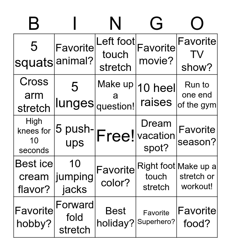 This bingo card has a free space and 24 words: 10 jumping jacks, Forward fold stretch, Make up a question!, Favorite hobby?, Favorite TV show?, 5 squats, Cross arm stretch, Favorite animal?, Dream vacation spot?, Favorite color?, 10 heel raises, High knees for 10 seconds, Right foot touch stretch, Make up a stretch or workout!, 5 lunges, Favorite Superhero?, Favorite season?, Left foot touch stretch, Run to one end of the gym, 5 push-ups, Favorite food?, Best ice cream flavor?, Favorite movie? and Best holiday?.