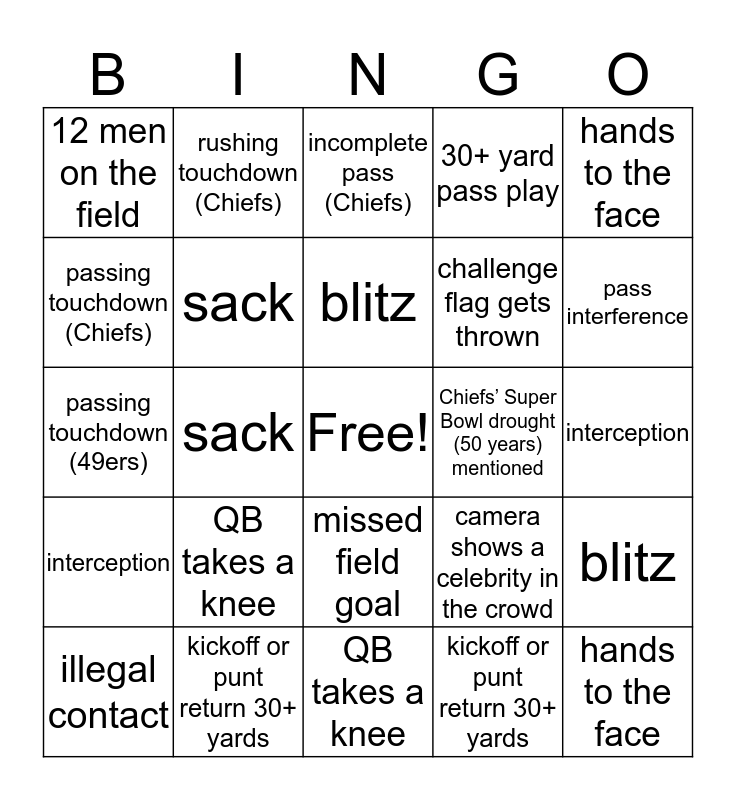 This bingo card has a free space and 117 words: false start, 20+ yard run play, 3 and out possession, camera shows a celebrity in the crowd, Andy Reid mentioned as winningest coach without a SB win, passing touchdown (Chiefs), 30+ yard pass play, camera shows Miami Beach, challenge flag gets thrown, Chiefs’ Super Bowl drought (50 years) mentioned, timeout, two-point conversion attempt, field goal (Chiefs), field goal 49ers, fumble, going for it on 4th down, missed field goal, 12 men on the field, Hail Mary, unnecessary roughness, illegal contact, incomplete pass (Chiefs), rushing touchdown (49ers), incomplete pass (49ers), QB sneak, interception, kickoff or punt return 30+ yards, missed extra point, holding, offside, pass interference, blitz, sack, passing touchdown (49ers), delay of game, rushing touchdown (Chiefs), hands to the face, QB takes a knee, injury on the field, incomplete pass (49ers), field goal 49ers, 20+ yard run play, 12 men on the field, delay of game, Andy Reid mentioned as winningest coach without a SB win, fumble, kickoff or punt return 30+ yards, passing touchdown (Chiefs), 30+ yard pass play, camera shows Miami Beach, challenge flag gets thrown, Chiefs’ Super Bowl drought (50 years) mentioned, timeout, two-point conversion attempt, field goal (Chiefs), false start, offside, going for it on 4th down, missed field goal, 3 and out possession, blitz, Hail Mary, unnecessary roughness, illegal contact, incomplete pass (Chiefs), camera shows a celebrity in the crowd, rushing touchdown (49ers), sack, passing touchdown (49ers), QB sneak, interception, holding, injury on the field, pass interference, missed extra point, rushing touchdown (Chiefs), hands to the face, QB takes a knee, 12 men on the field, 20+ yard run play, 3 and out possession, 30+ yard pass play, Andy Reid mentioned as winningest coach without a SB win, blitz, camera shows a celebrity in the crowd, camera shows Miami Beach, challenge flag gets thrown, Chiefs’ Super Bowl drought (50 years) mentioned, delay of game, false start, field goal (Chiefs), field goal 49ers, fumble, going for it on 4th down, Hail Mary, hands to the face, holding, illegal contact, incomplete pass (49ers), incomplete pass (Chiefs), injury on the field, interception, kickoff or punt return 30+ yards, missed extra point, missed field goal, offside, pass interference, passing touchdown (49ers), passing touchdown (Chiefs), QB sneak, QB takes a knee, rushing touchdown (49ers), rushing touchdown (Chiefs), sack, timeout, two-point conversion attempt and unnecessary roughness.