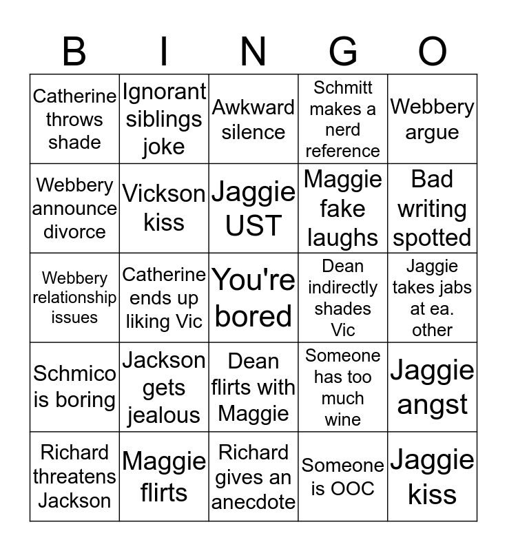 This bingo card has a free space and 24 words: Jackson gets jealous, Maggie flirts, Jaggie UST, Richard threatens Jackson, Webbery argue, Catherine throws shade, Webbery announce divorce, Ignorant siblings joke, Dean indirectly shades Vic, Dean flirts with Maggie, Maggie fake laughs, Webbery relationship issues, Someone has too much wine, Jaggie angst, Vickson kiss, Someone is OOC, Jaggie takes jabs at ea. other, Awkward silence, Bad writing spotted, Catherine ends up liking Vic, Jaggie kiss, Schmico is boring, Schmitt makes a nerd reference and Richard gives an anecdote.