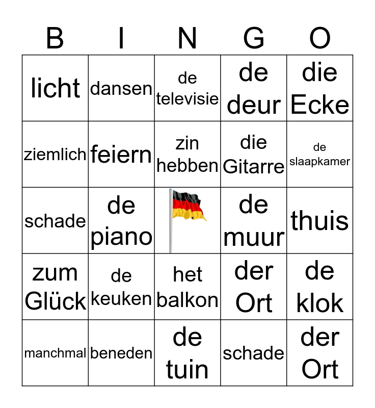 This bingo card has 1 images and 39 words: Tennis spielen, schade, fietsen, feiern, beneden, het balkon, zin hebben, das Regal, die Ecke, zum Glück, de piano, de deur, thuis, de muur, de keuken, die Sachen, licht, gleich, de televisie, de klok, schade, die Gitarre, ziemlich, saai, de kast, manchmal, leider, der Ort, de slaapkamer, de kast, manchmal, leider, der Ort, de slaapkamer, de tuin, mooi, vakantie, dansen and gezellig.