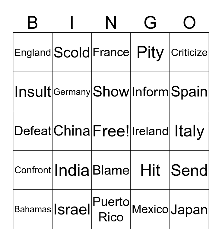 This bingo card has a free space and 29 words: Bahamas, Canada, China, Cuba, England, France, Germany, India, Ireland, Israel, Italy, Japan, Puerto Rico, Mexico, Spain, Finish touch, Blame, Confront, Criticize, Defeat, Hit, Influence, Inform, Insult, Pity, Scold, Send, Show and Tell.