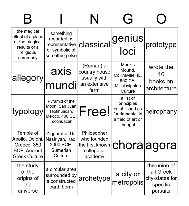 This bingo card has a free space and 24 words: Ziggurat of Ur, Nasiriyah, Iraq, 2000 BCE, Sumerian Culture, a circular area surrounded by a constructed earth berm, (Roman) a country house usually with an extensive farm, the study of the origins of the universe, prototype, the magical effect of a place or the magical results of a religious ceremony, allegory, something regarded as representative or symbolic of something else, a list of principles established as fundamental in a field of art or thought, Philosopher who founded the first known college or academy, Monk's Mound, Collinsville, IL. 950 CE, Mississippian Culture, typology, chora, agora, axis mundi, a city or metropolis, heirophany, classical, wrote the 10 books on architecture, Pyramid of the Moon, San Juan Teotihuacán, Mexico, 400 CE, Teotihuacán, the union of all Greek city-states for specific pursuits, Temple of Apollo, Delphi, Greece, 350 BCE, Ancient Greek Culture, genius loci and archetype.