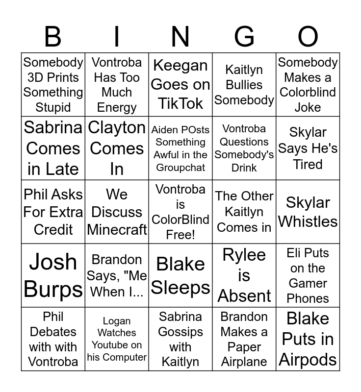 This bingo card has a free space and 26 words: Blake Sleeps, Brandon Makes a Paper Airplane, Aiden POsts Something Awful in the Groupchat, Logan Watches Youtube on his Computer, Somebody Makes a Colorblind Joke, Somebody 3D Prints Something Stupid, Sabrina Comes in Late, Vontroba Has Too Much Energy, Skylar Whistles, Rylee is Absent, Vontroba Questions Somebody's Drink, Phil Asks For Extra Credit, Eli Puts on the Gamer Phones, Phil Debates with with Vontroba, We Discuss Minecraft, Mr. Vontroba Makes the Juniors do SAT, Kaitlyn Bullies Somebody, Josh Burps, Keegan Goes on TikTok, Blake Puts in Airpods, Skylar Says He's Tired, Sabrina Gossips with Kaitlyn, The Other Kaitlyn Comes in, Brandon Says, "Me When I..., Clayton Comes In and Jarrett Gets Yelled at by Vontroba.