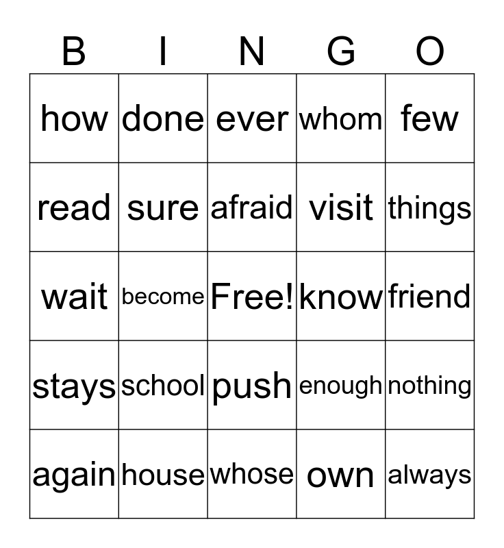 This bingo card has a free space and 24 words: school, house, afraid, again, few, how, read, done, know, push, visit, wait, enough, nothing, sure, own, friend, ever, things, become, always, stays, whom and whose.