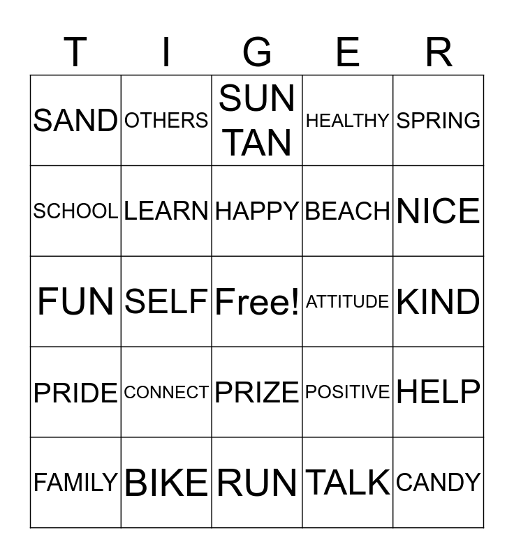 This bingo card has a free space and 39 words: TIGER, RESPECT, CARE, POSITIVE, HELP, PRIDE, SELF, SHARE, ATTITUDE, KIND, SCHOOL, OTHERS, FRIENDS, NICE, FUN, CONNECT, PRIZE, HEALTHY, SUN, FAMILY, LEARN, HAPPY, TALK, SPRING, SKI, BIKE, RUN, BOBBER, BASEBALL, SAND, PLAY, SWIM, BEACH, CANDY, CHILL, SHADES, SUN TAN, MELTING and PUDDLE.