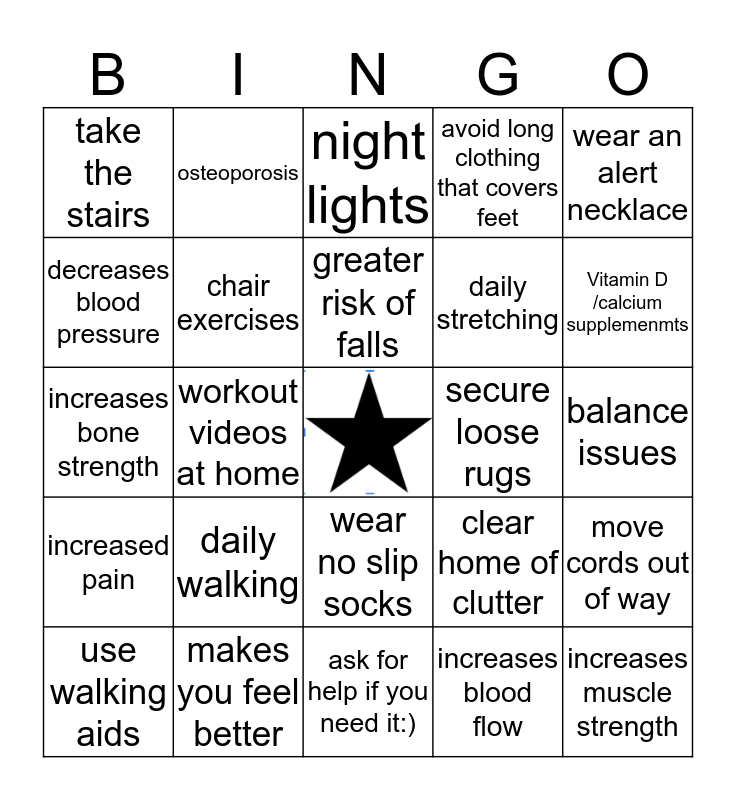 This bingo card has a free space and 24 words: daily walking, makes you feel better, greater risk of falls, use walking aids, wear an alert necklace, take the stairs, decreases blood pressure, osteoporosis, secure loose rugs, wear no slip socks, daily stretching, increases bone strength, clear home of clutter, move cords out of way, chair exercises, increases blood flow, balance issues, night lights, Vitamin D /calcium supplemenmts, workout videos at home, increases muscle strength, increased pain, avoid long clothing that covers feet and ask for help if you need it:).