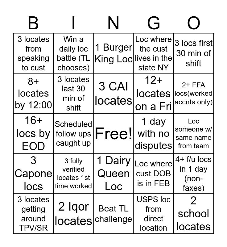 This bingo card has a free space and 24 words: 3 locates getting around TPV/SR, 3 fully verified locates 1st time worked, 3 CAI locates, USPS loc from direct location, 3 locs first 30 min of shift, 3 locates from speaking to cust, Win a daily loc battle (TL chooses), 1 Burger King Loc, 1 day with no disputes, Loc someone w/ same name from team, 16+ locs by EOD, 3 locates last 30 min of shift, Loc where cust DOB is in FEB, 4+ f/u locs in 1 day (non-faxes), 8+ locates by 12:00, 2 Iqor locates, Beat TL challenge, Loc where the cust lives in the state NY, 2+ FFA locs(worked accnts only), 3 Capone locs, Scheduled follow ups caught up, 1 Dairy Queen Loc, 12+ locates on a Fri and 2 school locates.