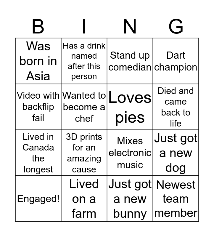 This bingo card has 23 words: Newest team member, Born on cupid's day, Died and came back to life, Just became a vegetarian, Video with backflip fail, Was born in Asia, Wanted to become a chef, Has a drink named after this person, Engaged!, FREE!, 3D prints for an amazing cause, Lived in Canada the longest, Best collection of shoes, Buys hot dogs on sale, Lived on a farm, Created a permanent art on the wall, Stand up comedian, Mixes electronic music, Loves pies, Just got a new dog, Dart champion, Just got a new bunny and Orders chicken fingers for lunch everyday.
