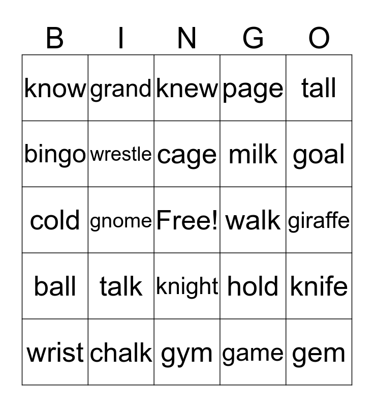 This bingo card has a free space and 29 words: wrist, wring, gnome, gnarl, know, knew, wrestle, talk, walk, chalk, giraffe, gem, gym, game, goal, great, knight, ball, tall, cold, hold, bold, milk, bingo, page, grand, knife, cage and giant.