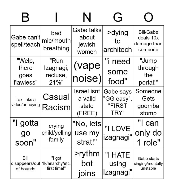 This bingo card has a free space and 24 words: crying child/yelling family, "I got 1k/anarchy/etc. first time!", (vape noise), Bill disappears/out of bounds, Bill/Gabe deals 10x damage than someone, Gabe can't spell/teach, "Welp, there goes flawless", bad mic/mouth breathing, Gabe says "GG easy", "FIRST TRY", "No, lets use my strat!", "i need some food", Lax links a video/annoying, "I LOVE izagnagi", "I can only do 1 role", "Run Izagnagi, recluse, 21%", "I HATE using Izagnagi", Someone Gets goomba stomp, Gabe talks about jewish women, "Jump through the portal!", Casual Racism, Gabe starts singing/mentally unstable, "I gotta go soon", >dying to architech and >rythm bot joins.