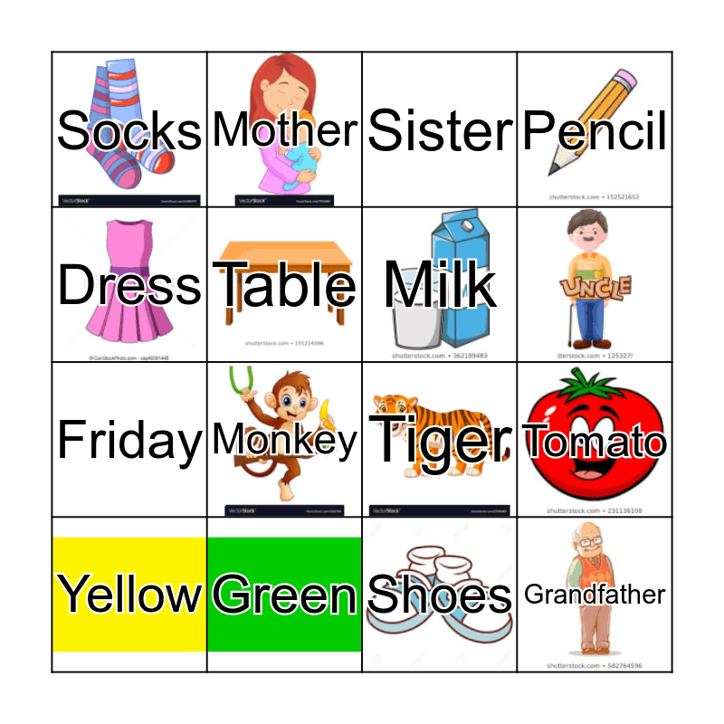 This bingo card has 14 images and 15 words: Green, Tomato, Sister, Socks, Friday, Mother, Tiger, Shoes, Dress, Table, Yellow, Pencil, Monkey, Milk and Grandfather.