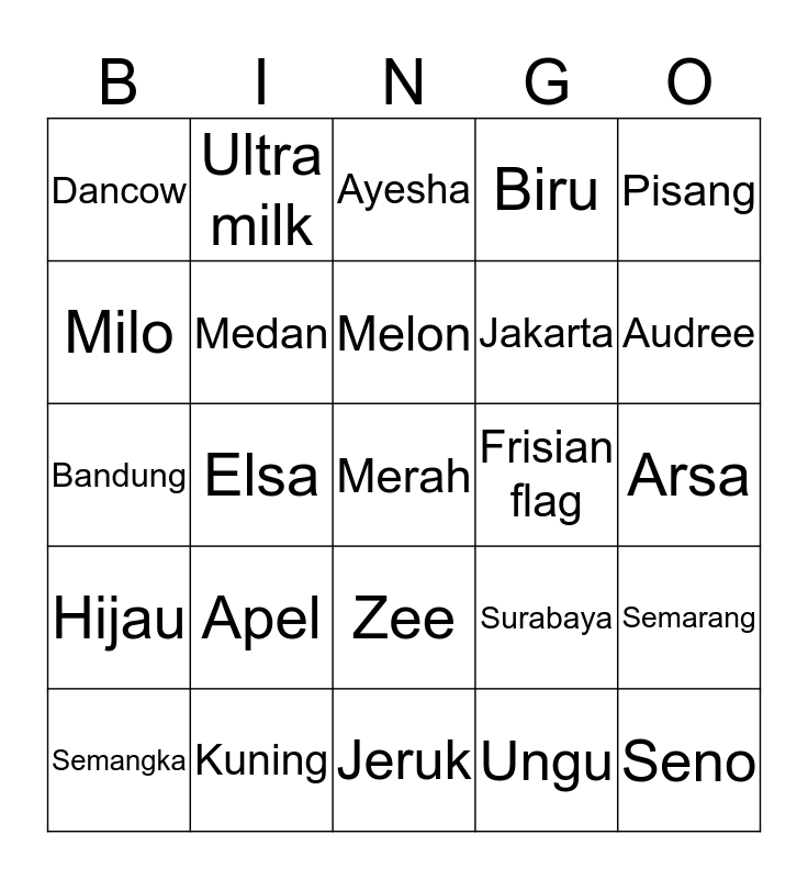 This bingo card has 25 words: Apel, Jeruk, Melon, Semangka, Pisang, Dancow, Milo, Ultra milk, Frisian flag, Zee, Jakarta, Bandung, Surabaya, Semarang, Medan, Seno, Arsa, Ayesha, Audree, Elsa, Merah, Kuning, Hijau, Biru and Ungu.